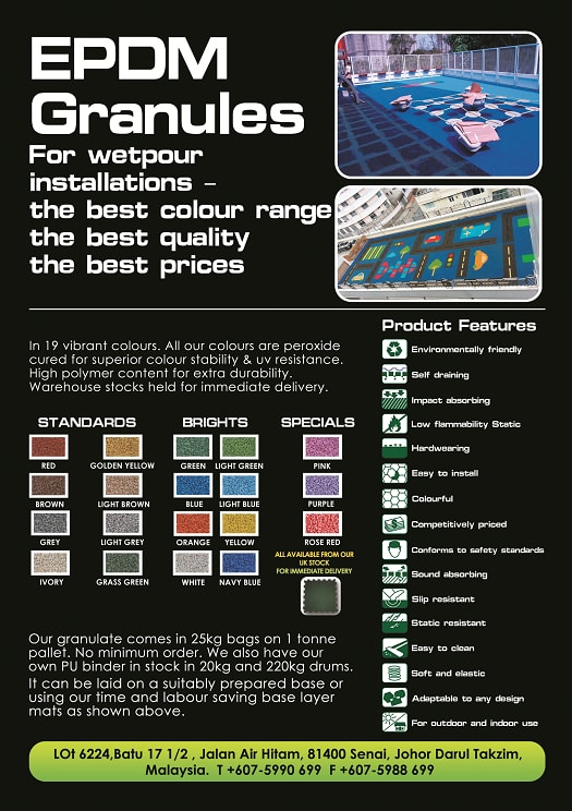Butiran karet berwarna (Granulated Rubber EPDM) adalah produk yang paling tahan lama yang tersedia. Lantai Karet dengan bahan EPDM memiliki warna sintesis dengan kombinasi khusus pigmen organik dan non-organik yang stabil. Tidak hanya memberikan ketahanan UV yang baik dan konsistensi warna, tetapi juga meningkatkan umur permukaan lantai. Dengan lebih dari 16 warna yang tersedia dalam berbagai ketebalan yang anti-UV. Rubber EPDM juga memiliki fisik yang sangat baik.